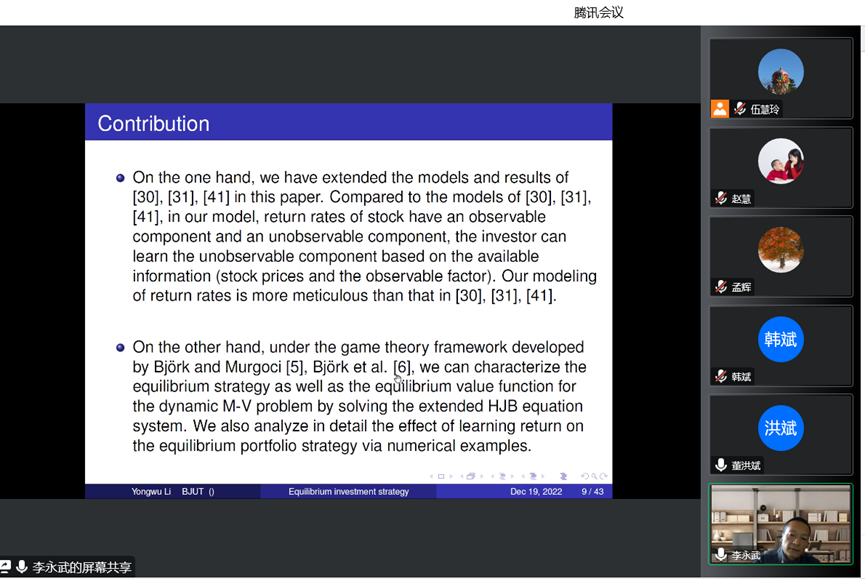 李永武博士的报告题目是“Equilibrium investment strategy with learning about equity return”。他假设股票价格满足一个几何布朗运动,但平均收益率由两部分组成,一部分是可观测的,另一部分是无法观测的。投资者能观测的信息是股票价格和平均收益率的部分可观测信息。在这样的假设下,研究了均值-方差均衡投资策略。论文得到了均衡投资策略的解析解,数值分析结果表明,当考虑部分信息时,能提高均衡值函数的值。