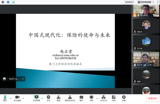 最后,赵正堂教授报告《中国式现代化:保险的使命与未来》,对党的二十大报告进行了解读,介绍了中国式现代化的内涵与特征,从养老保险、可持续保险、高质量保险、绿色保险、保险参与全球治理等角度阐述保险在中国式现代化中的责任使命,并对我国保险业的发展趋势作出展望。