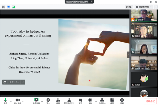 首先,郑家昆老师做题为《Too Risky to Hedge: An Experiment on Narrow Framing》的学术报告。在理论中,狭隘框架者专注于具体的投资决策,而忽视预先存在的风险,就会低估风险对冲的价值。他们通过在实验室中进行实验进行验证,通过激发受试者支付一系列彩票的意愿(WTP),这些彩票可以是纯风险投资,也可以是对其固有风险的完全保险。与理论预测一致,研究结果表明,更愿意投资的受试者也更愿意投保,而且受试者在损失领域的投保明显少于在收益领域的投保。这些观察结果可以用前景理论结合狭义框架共同解释。最后,他估计了狭义框架中的个体异质性——分布在两个极端倾斜,但在中间也有很大一部分群体。如果只关注极端情形,会导致高估狭隘框架的严重性。
