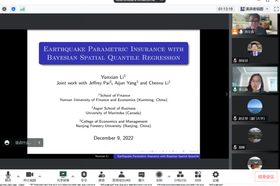 接着,李云仙教授报告《Earthquake Parametric Insurance with Bayesian Spatial Quantile Regression》。由于指数保险具有透明和快速的理赔支付的特点,其已被广泛用于自然相关的风险,如地震、洪水和飓风,的风险转移中。2014年,地震指数保险为中国云南省大理和玉溪等地发生的地震损失提供保险。然而,指数保险会导致基差风险。在报告中,她提出了一种贝叶斯空间分位数回归模型,以降低地震指数保险的基本风险。分位数回归模型分析并考虑了地震灾害、风险暴露和脆弱性对经济损失的影响。由于无法观察到震中的风险暴露和脆弱性,它们被视为分位数回归模型中的潜在变量。应用贝叶斯方法,并考虑空间相关性来构建潜在变量的先验分布。利用所提出的模型和方法收集并分析了云南省1992年至2019年的地震损失。然后计算了云南省16个地区的支付机制和相应的保费。结果表明,与现行地震保险相比,损失率更合理,从而降低了基本风险。