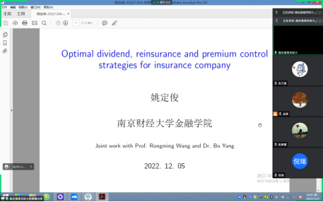 2022年12月5日,南京财经大学金融学院副院长,江苏社科优青,江苏省“333高层次人才培养工程”中青年学术带头人姚定俊教授应孟辉教授的邀请,做客新葡萄官网精算论坛讲座第216期。在讲座开始前,孟辉教授对姚教授表示欢迎,新葡萄官网以及中国人民大学等多名老师和学生参加讲座并进行交流。