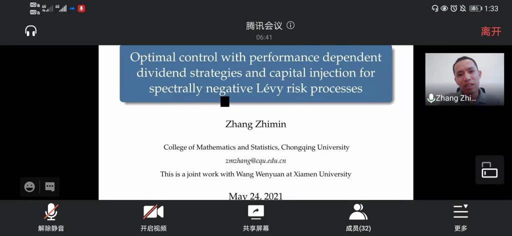 2021年5月24日下午,中国精算研究院邀请到重庆大学张志民教授和西南财经大学殷崔红博士做客精算论坛,他们分别给大家带来了题为“Optimal control with performance dependent dividend strategies and capital injection for spectrally negative Levy risk processes”和“车险综合改革下的自主定价研究”的报告。本次讲座由池义春研究员主持,中国精算研究院的部分师生和国内同行等30多人参加了本次论坛。