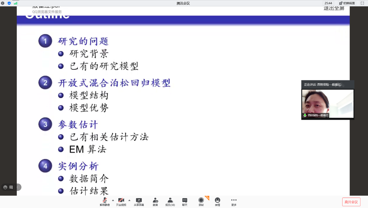 殷崔红老师则就车险综合改革下的自主定价问题进行讨论。首先,她介绍了已有的研究模型,包括混合模型、NB-混合模型、零调整模型以及回归模型。然后,基于2020年新颁布实施的《关于实施车险综合改革的指导意见》要求逐步放开自主定价系数的浮动范围,实现车险产品费率与其风险水平的更高匹配的背景,她提出了所要研究的问题。她分析了车险在零膨胀、异质性和长尾性等不同风险下的影响因素,以便根据车险产品的不同风险水平实现自主分类定价。最后,她介绍了Open Mixed Poisson (OMP)分布的开放式结构实现车险的自主风险分类,并且通过Poisson Regression (PR)模型的回归结构研究不同保单类的影响因素,据此对不同风险客户进行分类和定价,避免了车险产品的同质化。