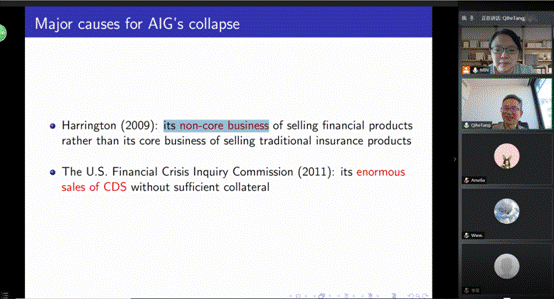 报告结束后,Tang教授就保险公司非核心业务面临的风险以及核心业务与非核心业务之间的关系与参与论坛的师生进行了深入地探讨,与会师生受益良多。 感谢新葡萄官网引智项目给予的支持。