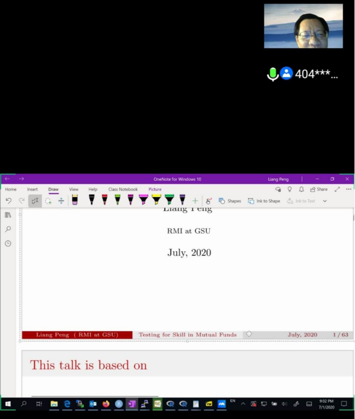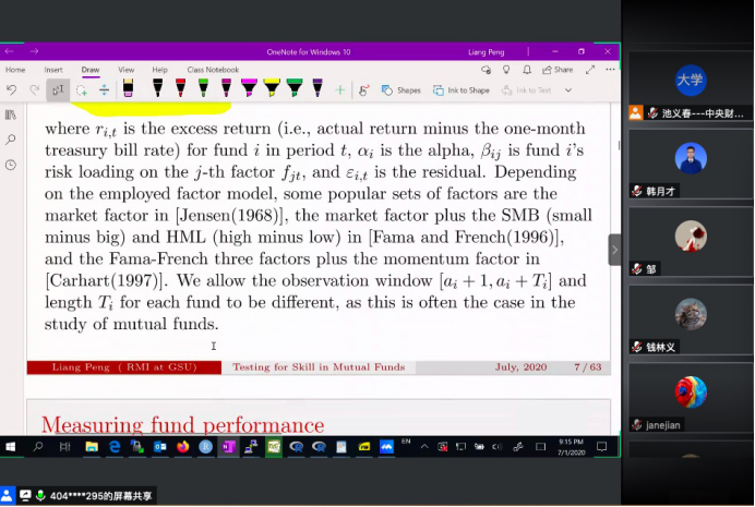 2020年7月2日上午,美国乔治亚州立大学罗宾逊商学院风险管理与保险系的彭亮教授通过腾讯会议软件在线为新葡萄官网师生做了题为 “Testing for skill in mutual funds”的学术报告。报告由中国精算研究院池义春研究员主持,包括新葡萄官网师生在内有50多名海内外学人参与此次论坛。