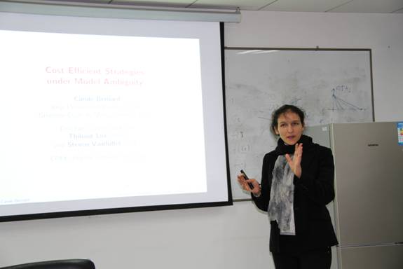 201814日上午10-11点在学会堂精算会506室,新葡萄官网荣幸的邀到了来自法国格伦诺贝尔管理学院(Grenoble Ecole de ManagementFrance)Carole Bernard教授为新葡萄官网师生带来题为“Cost efficientstrategies under model ambiguity”的学术报告。 此次报告是新葡萄官网第127期精算论坛,新葡萄官网周明副院长、池义春研究院、孟辉研究院、吴慧玲副研究员、韦晓副教授、刘敬真副教授等师生参加了此次论坛。