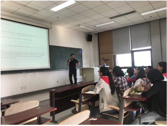 2017年4月18日下午3:30-5:30,任法国国家科学研究院(French National Research Center of Science,CNRS)数学研究所学术委员会研究员,法国巴黎中央理工(École CentraleSupelec) 数学学院副教授的Ludovic Goudenège老师在新葡萄8883官网AMG官网沙河校区主教406为新葡萄官网师生作了关于“Numerical Methods of Partial Differential Equations and its application in insurance”的讲座。此次短期课程为新葡萄8883官网AMG官网中国精算研究院论坛讲座第96期,是Ludovic Goudenège老师受邀来新葡萄官网与师生进行学术交流的重要环节。在本次讲座中,Ludovic老师介绍了在金融数学领域中十分常用的数值法,在简单地介绍了理论框架后结合保险保证条款(Guaranteed Minimum Withdrawal Benefit,GMWB)进行实例分析,并使用C程序和Matlab软件对方法进行了操作演示。新葡萄官网韦晓老师主持了本次讲座,全体2016级精算学研究生参与了本次讲座。