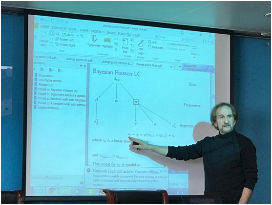 本次讲座题为“Extensions to the Bayesian Lee-Carter model, allowing for change points”,上午十点在学术会堂北楼702准时开始。此次报告也是新葡萄官网第八十八期精算论坛讲座,特邀了来自比利时布鲁塞尔自由大学的姚经博士作报告主持。新葡萄官网的周明副院长、周桦副院长、池义春研究员,以及相关专业的同学参加了此次论坛讲座。