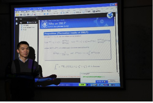 在李波博士的报告中,他介绍了其研究的关于谱负的Levy过程问题的最新的成果,并详细的阐述了其结果的在计算保险精算相关问题时的应用价值和其得到结果的一些新的证明方法和研究思路。在报告中,各位老师与李波博士在其领域进行了深入的交流与探论。
