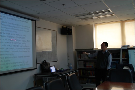 在整个报告过程中,Boda Kang教授一直与老师和同学有很好的交流,就建模方法以及统计分析手段等方面进行了深入地探讨。参加此次讲座的有来自新葡萄官网的池义春、伍慧玲、刘芳达,金融学院的陈锐以及统计与数学学院的杨凤红、梁超等老师和同学。Boda Kang教授这次关于原油期货市场波动率结构的报告,不但让我们了解了原油期货市场不同于普通证券市场的特征,而且通过实证分析也向我们展示了不同的数值算法和统计方法如何应用到实际问题中。