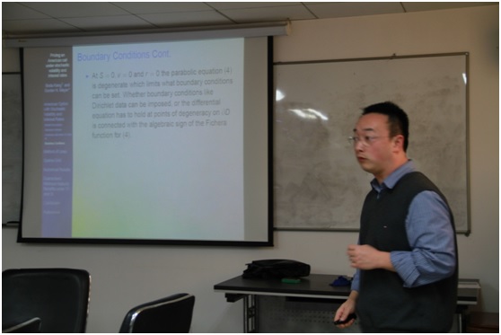 在整个报告的过程中,Boda Kang教授一直与老师和同学有很好的交流,就偏微分方程的解法以及在经济、金融和保险领域的应用进行了深入地探讨。参加此次讲座的有来自新葡萄官网的池义春、周桦、孟辉、董洪斌、韦晓、刘芳达等老师和同学。