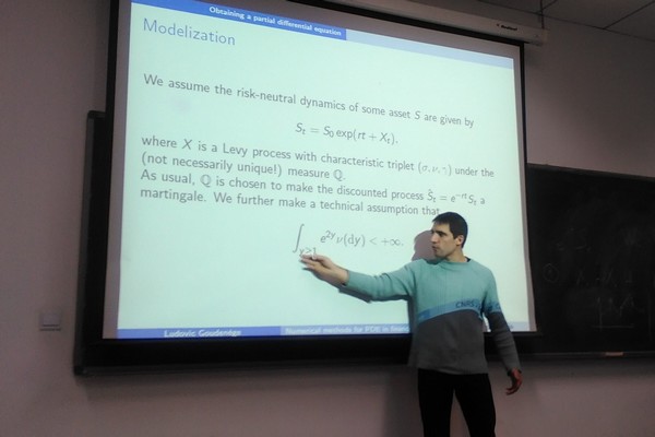 Ludovic Goudenege副研究员在本次讲座中重点介绍了基于随机分析理论,可以将金融产品定价问题等价转化为偏微分方程求解问题的思想。在讲座过程中,Ludovic Goudenege副研究员对Levy过程假定下金融产品定价转化为偏微分方程的方法、该偏微分方程的数值求解方法及边界问题进行了讲解与说明,并将在第二次讲座中对数值求解偏微分方程问题展开详细讨论及实例分析。在互动环节,Ludovic Goudenege副研究员解答了对同学们在推导求解过程中的疑惑,并对同学们的其他专业问题进行了积极回应。