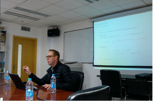 2014年11月7号上午,应新葡萄官网风险量化与决策研究中心的邀请,国际著名的精算学家Jan Dhaene 教授在中国精算研究院会议室为师生们带来了题为“Index option: a model-free approach”和“Option prices and model-free measurement of implied herd behavior in stock markets”的精彩学术讲座。新葡萄官网的杨再贵教授、周明研究员、郑苏晋副教授、韦晓副教授、董洪斌副研究员、伍慧玲副研究员和池义春副研究员等老师和部分研究生出席了此次报告。