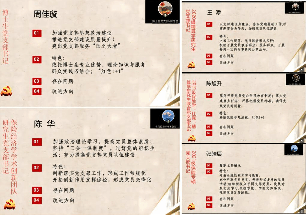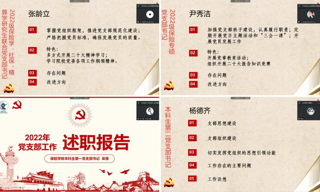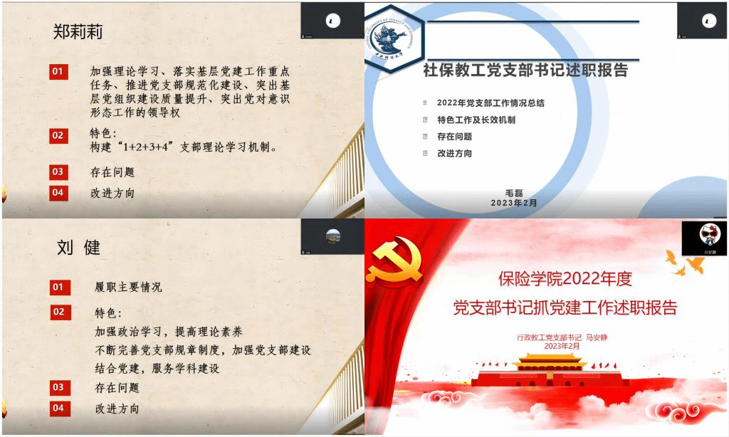 保险系教工党支部书记郑莉莉表示,党支部正在探索构建“1+2+3+4”理论学习机制,突出“一个核心”、聚集“两大能力提升”、坚持“三个相结合”、做好“四个方面融入”,进一步丰富理论学习的内涵和形式。社保教工党支部书记毛磊表示,过去一年里积极组织党员参与主题教育与政治理论学习,通过多媒体、互联网等线上方式丰富党建学习形式,努力提升党建学习效果。精算教工党支部书记刘健表示,2022年支部努力服务学科建设,规划了理论联系实践的学术科研交流活动,并在学院启动相关项目之后做了相应合并和进一步规划,未来将进一步鼓励成员们把党的理论切实应用到教学科研工作中。行政教工党支部书记马安静表示,过去一年支部在为群众办实事方面成效卓著,疫情防控时主动作为,发挥了党员先锋示范作用,未来将进一步开展“踏踏实实办实事”等活动,以党建促发展,集中精力解决师生遇到的实际困难。