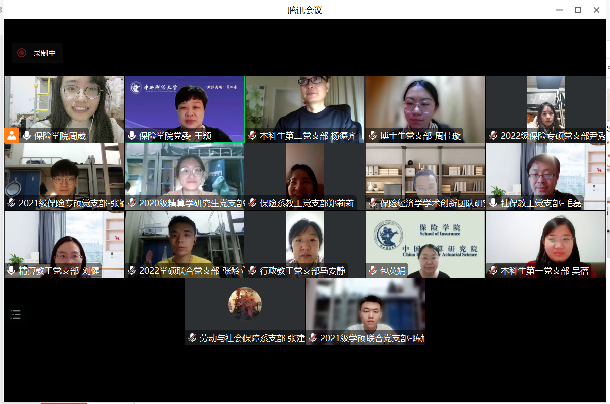 博士生党支部书记周佳璇表示,2022年支部延续以往合作优势,与恒大幸福家园第一社区党支部开展红色“1+1”支部共建活动,活动成果显著。保险经济学学术创新团队研究生党支部书记陈华汇报了主要工作,展示“党支部建在学术团队上”的特色,表示在以后的工作中,将继续把党建工作融入学院教学、科研、教师发展和学生培养,在完善组织、落实制度、提高工作能力上下工夫。2020级精算学研究生党支部书记王添表示在以后的工作中,将更多地安排实效性强的线下党日活动,提升支部活动的朝气,鼓励积极分子踊跃参与党日活动,努力向党组织靠拢。2021级保险学、社保、精算学研究生联合党支部书记陈旭升表示,支部始终坚持规范开展党员党内学习教育制度,针对支部对党员教育治理措施不足的问题,将进一步注重学习效果,激发党员学习热情和参与活动积极性。2021级保险专硕党支部书记张皓辰从支部建设情况、党员发展工作、支部活动开展情况三方面作履职情况汇报,全方位总结了2022年抓党建工作情况,他提到,作为毕业生党支部,将更多地组织支部线下活动,加强组织凝聚力。