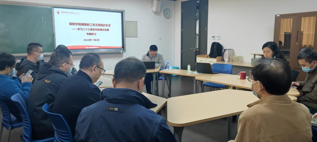 2022年11月2日下午1:30,精算教工党支部在沙河校区学院楼13号楼205召开党员大会,开展“学习党的二十大报告和新党章”专题研讨。支部党员结合个人学习情况,开展了学习交流。