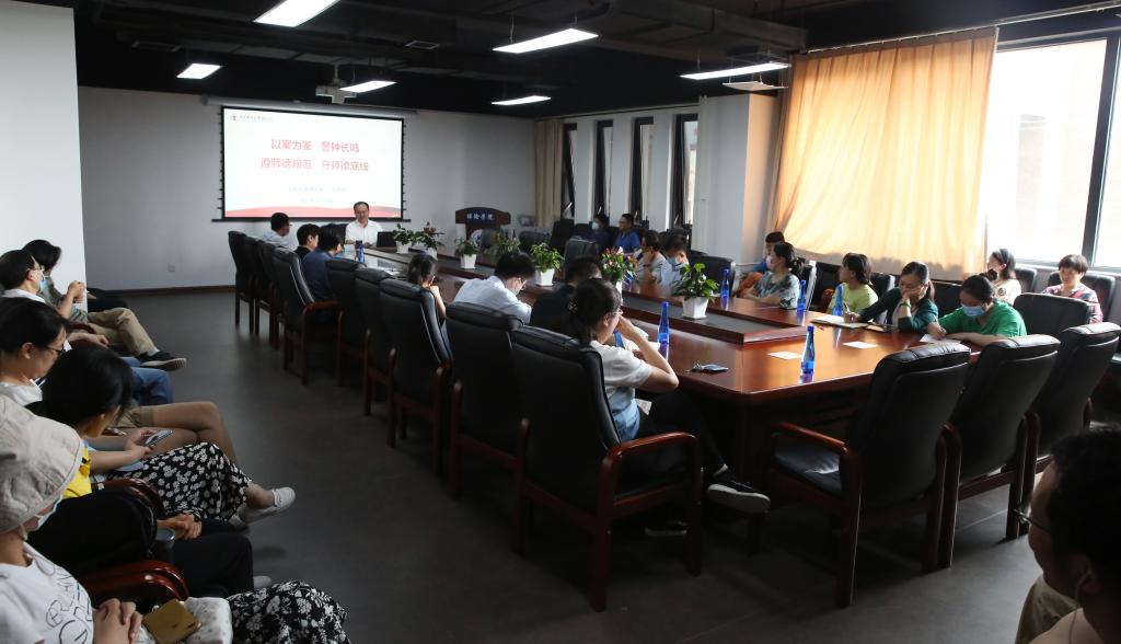 王颖书记在总结中指出,刘培元老师讲述的大量案例,并就各类违反师德师风典型案例的原因进行剖析,起到很强的警示教育作用,有助于教师对照查摆自省,做到警钟长鸣。她强调,值此中国共产党百年华诞之际,我们要深入学习贯彻习近平总书记关于教育的重要论述和在全国教育大会上的讲话精神,汲取智慧和力量,不断奋斗和前行;要把政治忠诚贯穿于教书育人全过程,在政治方向、政治立场、政治观点等大是大非问题上,立场不含糊、信念不动摇、方向不偏离;要坚持“为党育人、为国育才”,强化“四史”学习、坚定理想信念,厚植爱国情怀,涵养高尚师德。