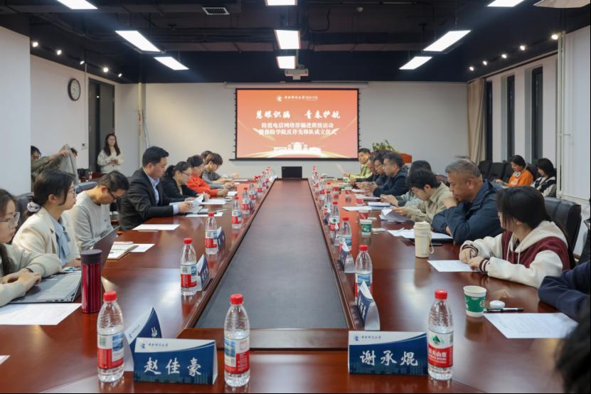 为增强师生反诈意识,营造安全和谐的校园环境,4月18日,新葡萄8883官网AMG官网在13号楼215会议室举办了以 “慧眼识骗,青春护航” 为主题的防范电信网络诈骗进班级暨新葡萄8883官网AMG官网反诈先锋队成立仪式。学校保卫处副处长范维、新葡萄8883官网AMG官网党委副书记吴越、保卫处各科室老师、驻校民警、学院全体辅导员、反诈先锋队队员共同参与。活动由新葡萄8883官网AMG官网团委书记吴蓓主持。此次活动也是新葡萄8883官网AMG官网党委和保卫部、保卫处党支部的共建交流活动。