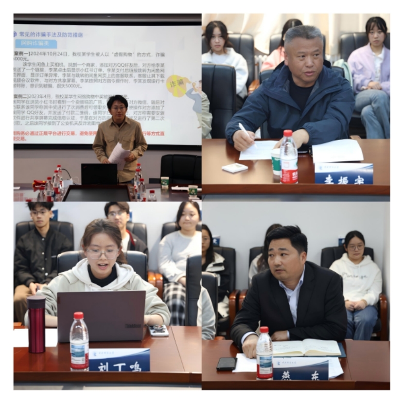在案例分享环节,保险23班的刘丁鸣同学结合身边真实的诈骗案例,生动形象地展示了诈骗手段的多样性和隐蔽性,让同学们深刻认识到诈骗可能就在身边。新葡萄8883官网AMG官网学生工作办公室主任燕东分享了本学院学生遭遇诈骗的案例,深入剖析了同学们在面对诈骗时的弱点和误区,并分享了自己在反诈工作中的心得体会,帮助同学们提升识别诈骗的能力。保卫部安全教育科李毅则从校园整体角度出发,对校园反诈案例进行解析,还结合前期反诈相关问卷调查结果,针对同学们普遍存在的疑惑和薄弱环节进行了详细的知识宣讲,为同学们筑牢防诈防线提供了实用的指导。沙河校区驻校民警李振宇结合自身日常处理电信网络诈骗案件的丰富经验,强调了诈骗案例的警示作用,鼓励同学们向身边的人传递防诈知识,形成更广泛的防护网,警校联动共同织密校园反诈“安全网”。